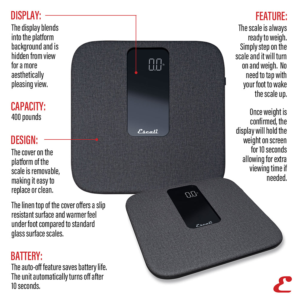 The Escali ComfortStep F180B is a unique bathroom scale with a removable linen topped cover. This removeable cover makes the scale extremely easy to clean. The linen top makes the scale slip resistant, offering a better footing compared to a traditional glass platform, while also offering the comfort of a warmer feel under foot on those cold early mornings. The scale features a hidden LED display that blends into the background of the platform making it more aesthetically pleasing. You will not notice the display until you step on the scale and the weight begins to be displayed. The display is bright and easy to read thanks to the backlit numbers but there is no need to worry about batteries being drained as the scale will automatically shut off after 10 seconds. The scale also boasts instant-on technology meaning that you can step on the scale at any time and weigh yourself. There is no need to wake the scale up by tapping it with your foot. Once the weight has been confirmed the display hold feature will keep the weight on screen for 10 seconds giving ample viewing time if needed after stepping of the scale. With a 400 lb capacity and simple, elegant design, the F180B fits the needs of most households and will match nearly any bathroom décor.